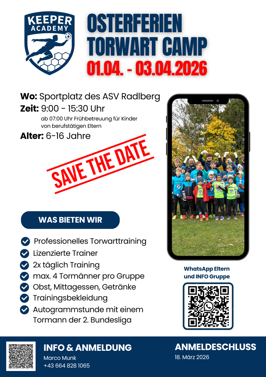 Erlebe drei unvergessliche Tage voller Torwarttraining, Spaß und Action in den Osterferien! Unser Osterferien-Torwartcamp in Radlberg richtet sich an Kinder und Jugendliche, die ihr Können im Tor verbessern und dabei jede Menge Spaß haben möchten.